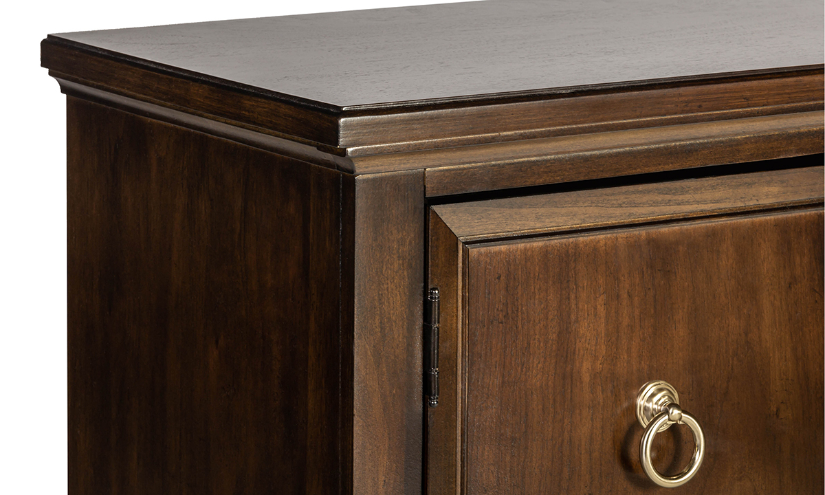 As the finishing touch to your dining room ensemble or a helpful companion in a kitchen or entertainment space, the Kensington Walnut Sideboard marries flexible storage with subtly traditional design. Meticulously crafted from sturdy Poplar solids and Walnut veneers, this 58-inch wide sideboard features a hand applied Moderne Walnut finish, accentuating the natural woodgrain in the veneers. The two outer cabinets, concealing a removable storage shelf and bottle rack, and two central storage drawers keep all your entertaining essentials close at hand and neatly tucked away. Subtle finishing touches, like the champagne-hued hardware and sophisticated tapered legs gives this piece a laid-back sophistication that will instantly elevate any ensemble.
