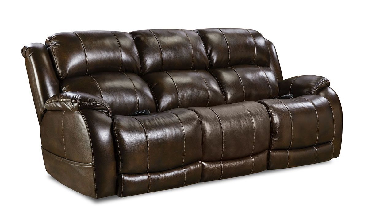 Made in America from top grain brown leather with leather-look fabric match on back and outer sides for worry-free enjoyment, the full living room set features four recliners with extended footrests, remote controlled power reclining, headrest, and lumbar with storage pockets, and pillowtop armrests.