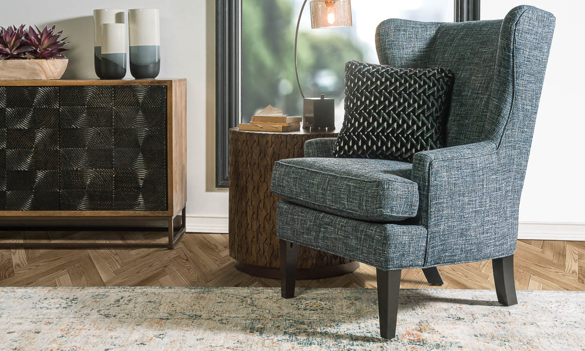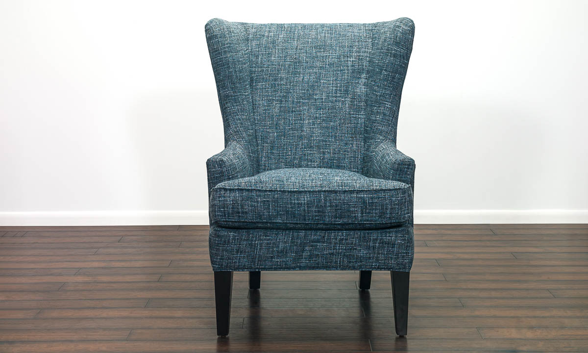 Balancing an elegant wing back silhouette in cool, blue fabric upholstery, this wing chair is versatile and accents any room with ease.