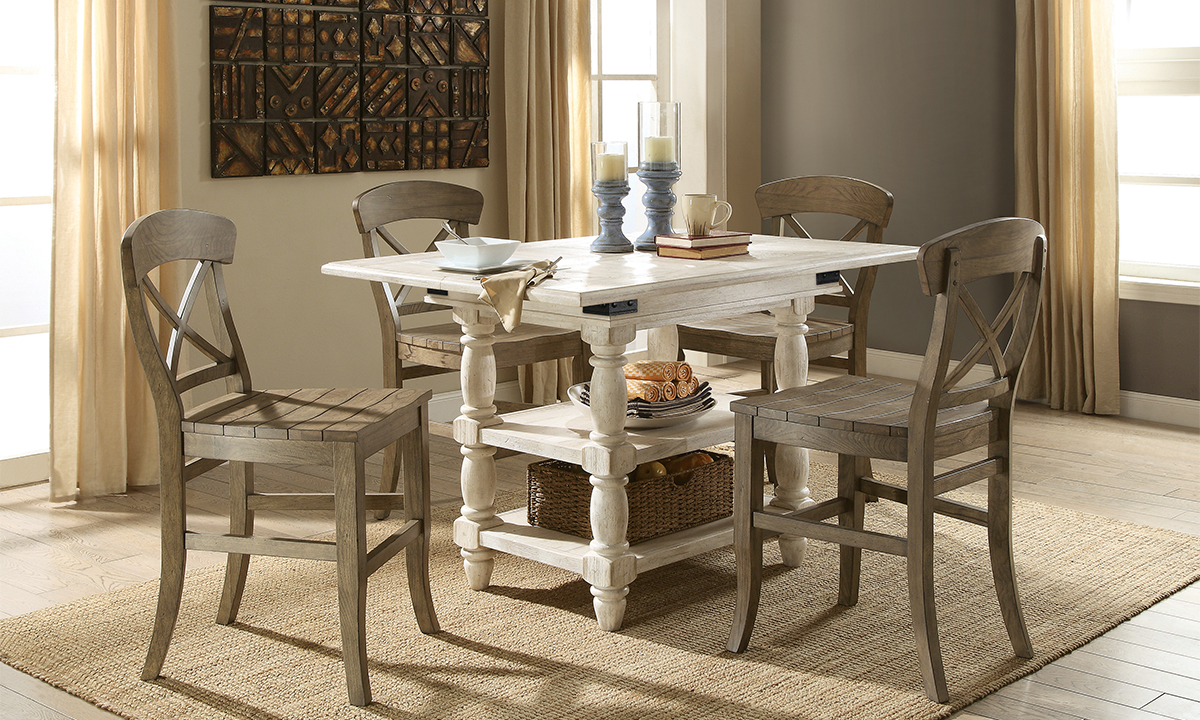 Enhance your dining area with the Regan Farmhouse Extendable Counter Table. Featuring a farmhouse white finish and constructed of hardwood solids and veneers, this table combines rustic charm with durability. The extendable design allows you to adjust the table size to accommodate your needs, while the built-in shelving provides convenient storage options.